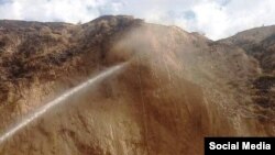 Озодликка келган видеода тўпланиб турган одамлар кўз ўнгида улкан сув босими остида тепалик четида чети кўриниб турган хум атрофидаги тупроқни ювишаётганини кўриш мумкин.