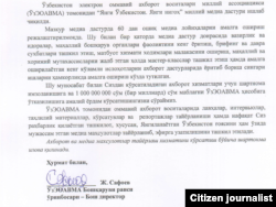 Озодликка Бош вазир ўринбосари босими остида ЭОАВМА билан шартнома тузишга мажбур бўлган давлат ташкилотларидан бири¸ қолаверса¸ тижорат банки мулозими ўз идораси раҳбари номига ëзилган хат ва унга илова қилинган келишув нусхасини тақдим қилди.
