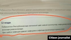 12- моддада "Ўзбекистон Республикасида ижтимоий ҳаёт сиёсий институтлар, мафкуралар ва фикрларнинг хилма-хиллиги асосида ривожланади. Ҳеч қайси мафкура давлат мафкураси сифатида ўрнатилиши мумкин эмас", дейилган.