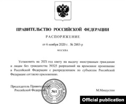 Бош вазир Михаил Мишустин имзолаган янги ҳужжатга кўра эса, 2021 йилда чет элликлар ва фуқаролиги бўлмаган шахсларга Россияда вақтинча яшаш учун бор-йўғи 39325 та рухсатнома бериш квотаси белгиланди. Бу эса ўтган йилларга қараганда бир неча баробар кам кўрсаткич.