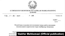 Вазирлар Маҳкамасининг Озодликка нусхаси келиб тушган 148- қарорига ХДФУ (Хизмат доирасида фойдаланиш учун) грифи қўйилган.