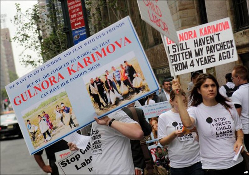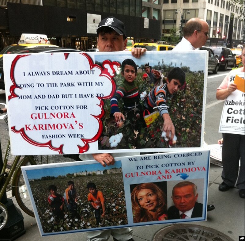 15 -16 сентябр кунлари Ғарб нашларининг барчаси ўзбекистонлик Юсуф Собиров кўтариб олган бир плакатни намойиш қилишди. “Мен ҳам ота-онам билан боғларда сайр қилишни истайман¸ аммо бунинг ўрнига Гулнора Каримова мода ҳафтаси учун пахта теришим шарт” деб ëзилган пахта тераëтган ўзбек болалари сурати ëнига бу плакатда.