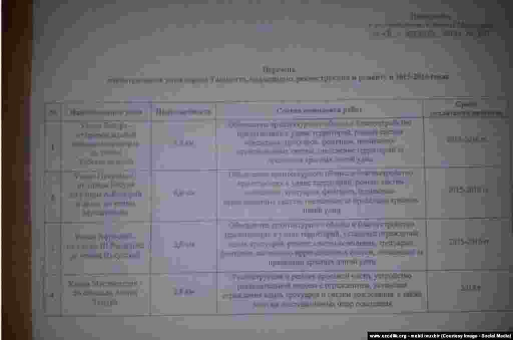 Тошкентдаги тўққизта кўча Вазирлар Маҳкамасининг жорий йил 5 августдаги “Тошкент шаҳри магистрал кўчаларини реконструкция ва модернизация қилишга доир қўшимча чора-тадбирлар тўғрисида”ги 227-сонли қарори асосида бузилади.