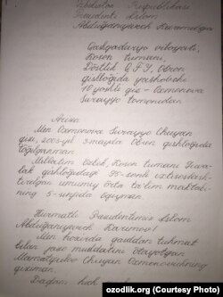 Президент Ислом Каримов номига 10 яшар қизалоқ томонидан ёзилган хат баробарида ҳуқуқ фаолининг рафиқаси Дилором Маманова жамоатчиликка мурожаат қилиб, Жаслиқ лагерида қолаётган турмуш ўртоғининг аҳволи оғирлигини таъкидлайди: