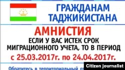 Тожикистон ватандошлари учун миграция амнистияси жорий этилганини Озодликка Тожикистоннинг Москвадаги элчихонаси расмий вакили Иброҳим Аҳмадов тасдиқлади. У бугунги кунда Россияда 1 миллиондан зиёд тожикистонлик яшаб, меҳнат қилаётганини билдирди.