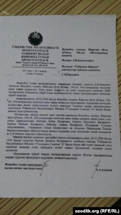 Бахметова Яшнобод тумани прокуратураси, Тошкент шаҳар ИИБ, Жиноят ишлари бўйича Тошкент шаҳар суди, Тошкент шаҳар санитария-эпидемиология назорати маркази, Республика суд экспертизаси маркази томонидан берилган ҳужжатларнинг нусхаларини Озодликка йўллади.