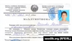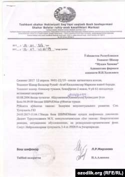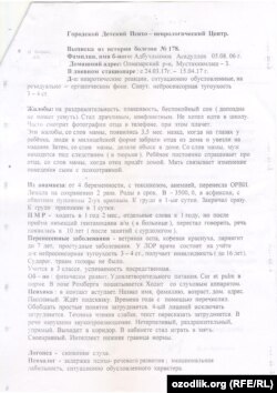 Ўша ҳодисадан сўнг Тошкент шаҳар Болалар рухий-асаб касалликлари марказидан берилган хулосада, болага бирор "вазият таъсирида юзага чиққан резидуал-органик фондаги невротик реакция" ташҳиси қўйилди.