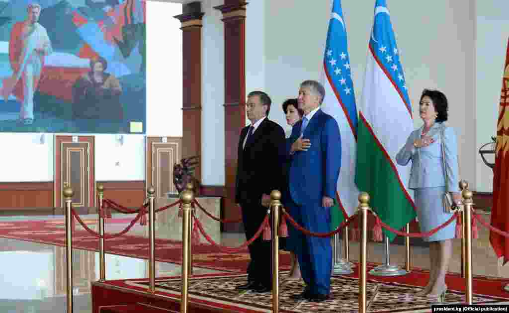 Президент Шавкат Мирзиёев 5 сентябрь куни Қирғизистон вақти билан соат 14да Бишкекка давлат ташрифини амалга ошириш учун келди. “Манас” аэропортида Миллий гвардия фахрий қоровули тизилиб, Шавкат Мирзиёев ва унинг рафиқаси Зироатхон Мирзиёевани Қирғизистон президенти Алмазбек Атамбаев рафиқаси Раиса Атамбаева билан кутиб олди.