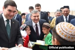 Мажмуада президентларни ўзбек ва туркман миллий либосларини кийган болалар қарши олди.