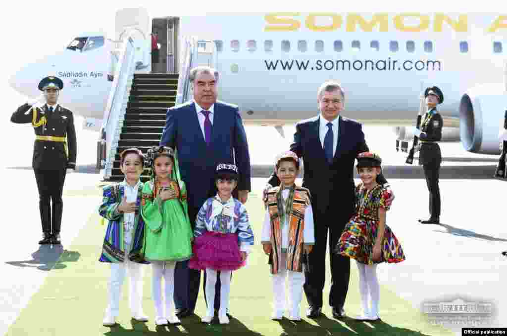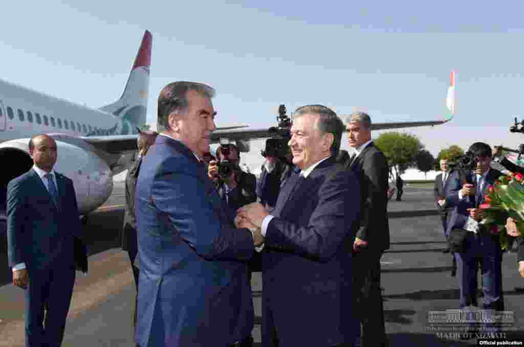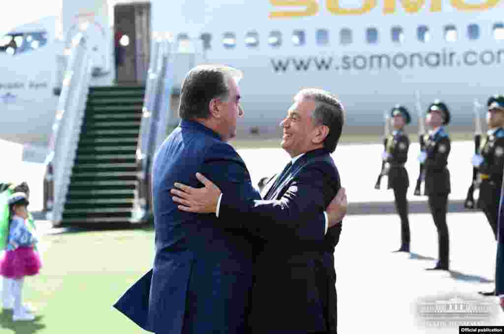 Тожикистон президенти Эмомали Раҳмон Ўзбекистон президенти Шавкат Мирзиёевнинг таклифига биноан 17 август куни эрталаб давлат ташрифи билан Тошкентга келди. Ислом Каримов номидаги Тошкент халқаро аэропортида олий мартабали меҳмонни Шавкат Мирзиёев кутиб олди. Олий мартабали меҳмонни аэропортда кутиб олиш маросими Ўзбекистон тарихида биринчи марта “Ўзбекистон 24” телеканали орқали жонли эфирда намойиш этилди.Суратлар www.president.uz'дан олинди.