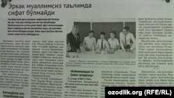 Ўзбекистон мактабларида кейинги йилларда эркак ўқитувчилар сони кескин камайиб кетди (“Оила даврасида”, 27 декабрь). Эркак ўқитувчиларнинг таълим тизимини тарк этишига эса биринчи навбатда рўзғор тебратиш учун етарли маош ололмагани сабаб бўлган. Эркак педагогларнинг камайиб кетиши мактабларда таълим сифати ва тартиб-интизомга салбий таъсир қилмоқда. Самарқанд шаҳридаги 10-мактаб директори Гулмира Юнусовага кўра, таълим масканларида эркак муаллимларнинг кўпайиши ўқувчиларнинг одоб-ахлоқи ва хулқига ижобий таъсир кўрсатади. Мақолада эркак ўқитувчилари кўп бўлган мактабларда битирувчиларнинг олий ўқув юртига кириш кўрсаткичи юқори экани таъкидлангани ҳолда, бу борада расмий статистика келтирилмаган. Қайд этилишича, айни пайтда тизимга эркак педагогларни қайтариш чоралари кўрилмоқда. Сўнгги 4 ойда 13 мингга яқин эркак ўқитувчи мактабларга қайтган.