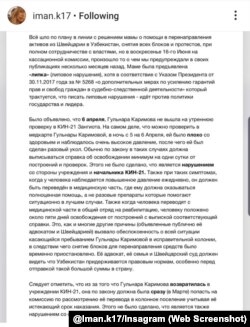 Имон Каримова эса онаси билан учрашувидан сўнг Instagram саҳифаси орқали президент Шавкат Мирзиëевга мурожаат қилди.