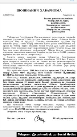 Хусусан, Андижон вилоят ҳокими Шуҳрат Абдураҳмонов имзолаган "Шошилинч хабарнома"да вилоятни президентга "намунали" кўрсатиш учун бюджет ишчиларини 4 август куни "лопатка, кетмон ва бошқа асбоблар" билан ҳашарга чиқариш буюрилган.