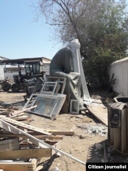 Хивалик фаоллардан олинган суратларда боши оқ мато билан ўралган санъат асарининг бузилган техника ва қурилиш чиқиндилари сақланадиган очиқ жойда турганини кўриш мумкин.