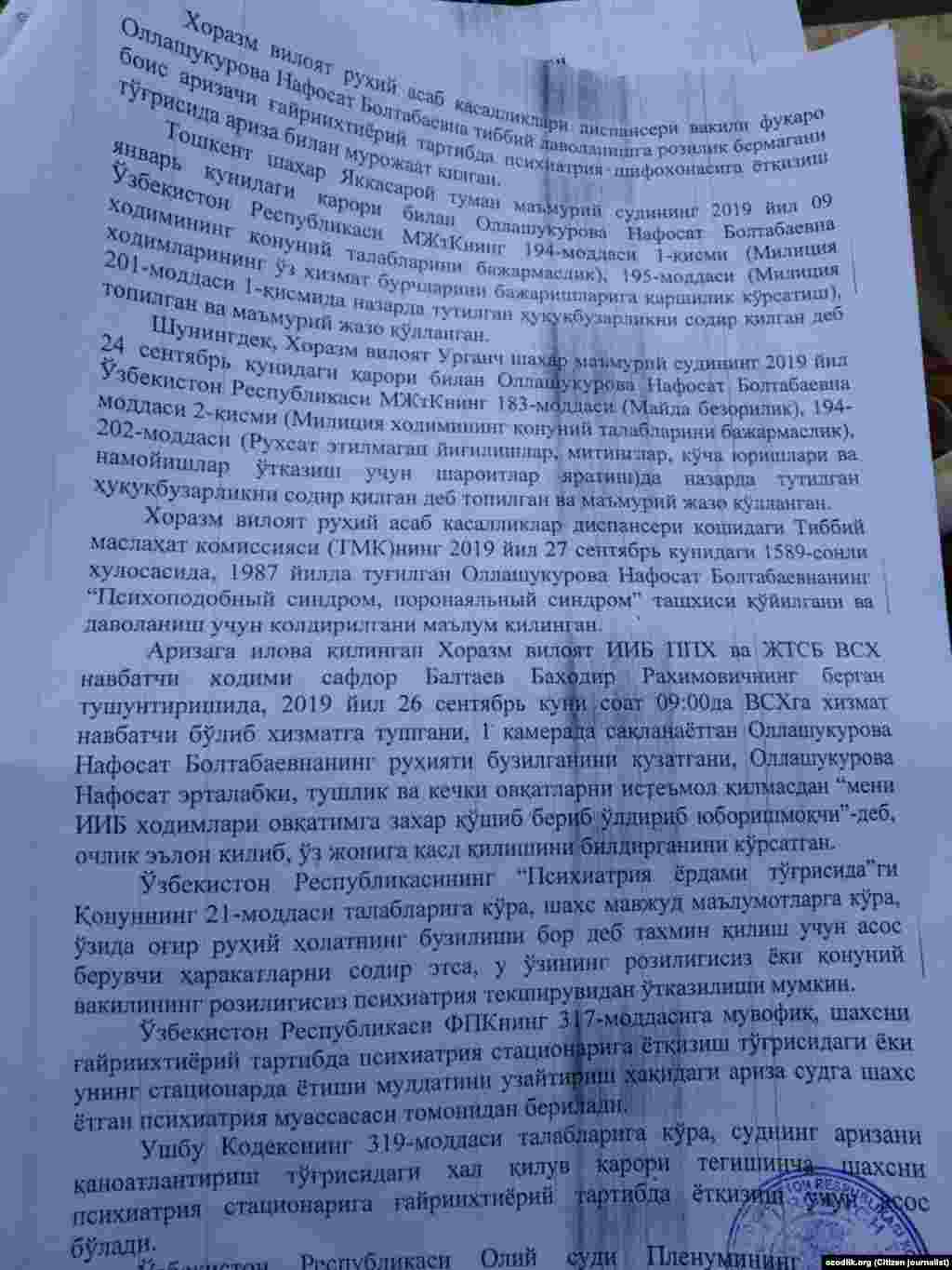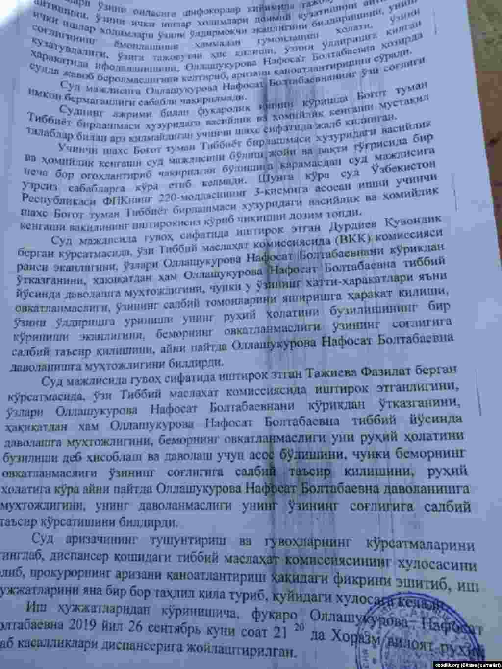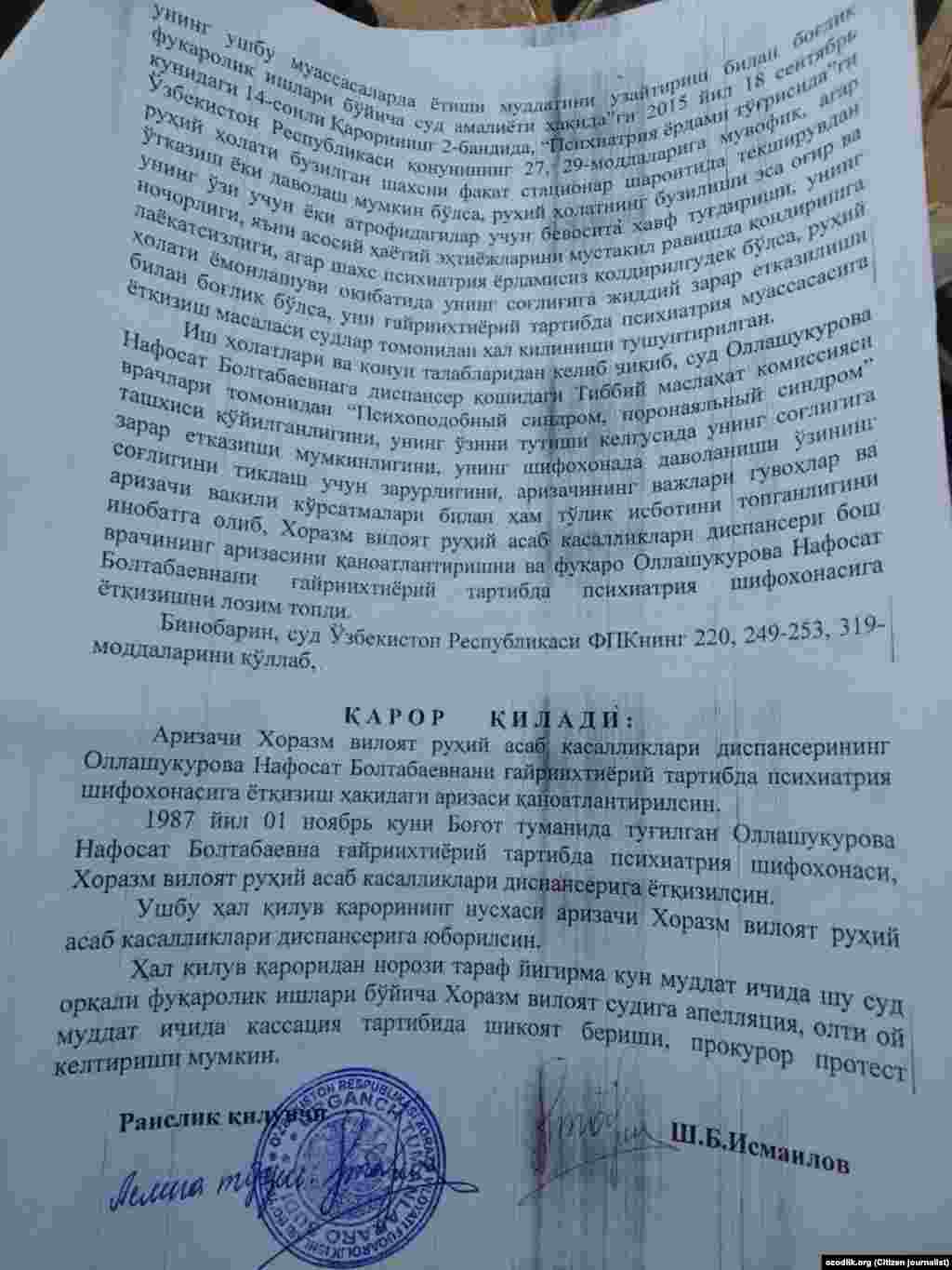 Нафосат Оллашукуровани руҳий касалхонага ётқизиш ҳақидаги суд қарори