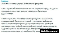 “Биринчидан, яна эски давр талаблари бўйича шаклланган, амалда ғоявий банкрот ва сунъий тузилмаларга айланган чўнтак партияларга суянилди. Бу партияларнинг ҳеч бири, масалан, менинг сиёсий, иқтисодий, ижтимоий қарашларим ва қадриятларимни акс эттирмайди. Мен ўзимни улар билан ассоциацияланишни ҳам истамайман. Шу маънода ташаббускор гуруҳлардан номзод кўрсатиш каналига рухсат берилишини кутгандим. Афсуски, бундай бўлиб чиқмади”, деб ёзади О. Бакиров.