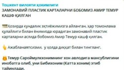 "Ҳозирда кундалик эҳтиёжимизга айланган, ҳар томонлама қулай замонавий пластик карталарни аслида Амир Темур бобомиз кашф қилган", деб ҳисоблайди Республика Маънавият ва маърифат маркази Тошкент вилояти бўлими раҳбари Сайёра Файзиева.
