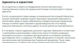Ҳар куни карантин тартибини бузгани боис жазоланган шахслар ҳақида маълумотлар эълон қилинмоқда. Қайд этилишича, адвокатлар иштирок этмас экан, ушбу ҳолатларнинг қонунийлиги шубҳа остида қолиши тайин.