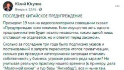 “Тўғрисини айтганда, сўнгги уч йил ичида хусусийлаштириш натижаларини қайта кўриб чиқишни тақиқлаш тўғрисида қанчадан-қанча фармон ва қарорлар имзолангани, президент томонидан неча марта дўқ-пўписалар қилиниб, хусусий мулк дахлсизлиги ҳимоя қилинганини аниқ эслолмайман, ҳисобда адашиб ҳам кетганман”, - дейди Ю. Юсупов.