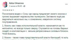 “Сўхда халқ ҳозирги ҳокимдан норози бўлиб, ўзларининг номзодини таклиф қилаётган видеони кўрдим. Кўрдиму биз давлат бошқаруви тизимини расвосини чиқариб юборганимизга яна бир марта амин бўлдим” , - деб ёзади давлат бошқаруви бўйича мутахассис Азиза Умарова.
