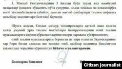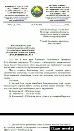 Наманган вилоят Халқ таълими бошқармаси Ахборот хизмати Озодликка бу хат ҳақиқийлигини тасдиқлади.