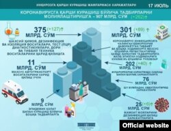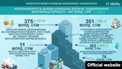 Расмий маълумотга кўра, Молия вазирлиги қошидаги Инқирозга қарши курашиш жамғармаси томонидан пандемия бошланганидан 17 июлгача СЭОАга жами 907 миллииард сўм маблағ ажратилган.