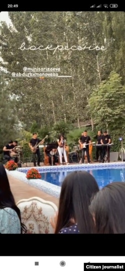 Кўринишидан ҳокимнинг шахсий ҳовлисидаги бассейн бўйида кундуз бошланиб¸ тунга қадар давом этган тадбирни Тошкентдан махсус чақиртирилган Муниса Ризаева ва бошқа санъаткорлар ўтказди.