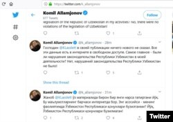 Twitter саҳифасида учта тилда ëзилган қисқа баëнотида Алламжонов¸ ўз фаолиятида "Ўзбекистон қонунлари бузилмаган"ини айтиш билан чекланди.