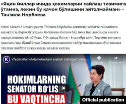 Олий Мажлис Сенати раиси Танзила Норбоева ҳокимларнинг сайланиши борасидаги баҳслар юзасидан фикр билдирди (www.kun.uz, 6 октябрь).