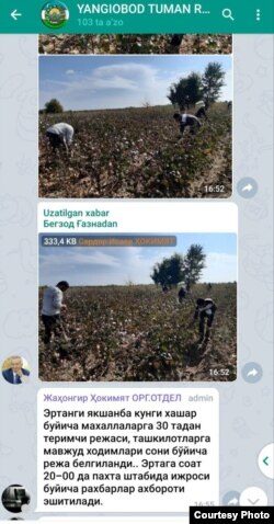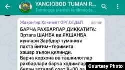 “Барча раҳбарлар диққатига: Шанба ва якшанба кунлари Зарбдор туманига пахта йиғим-теримига ҳашар эълон қилинди. Барча корхона ва ташкилотлар раҳбарлари барча ходимлари билан эрталаб соат 8:00дан пахта даласида бўлиши шарт”, дейилади Телеграм ёзишмасида.
