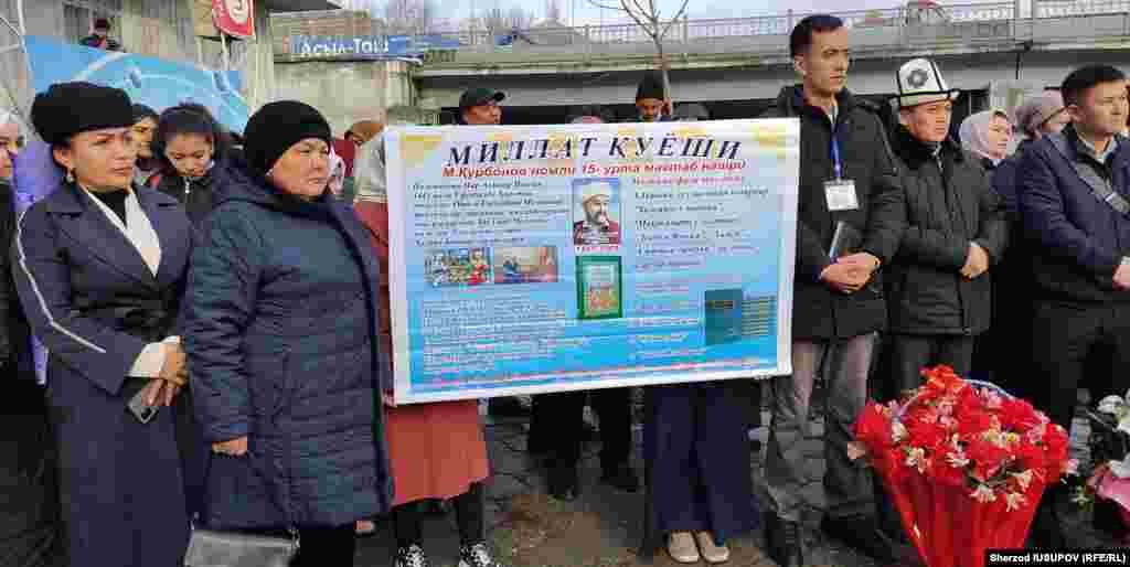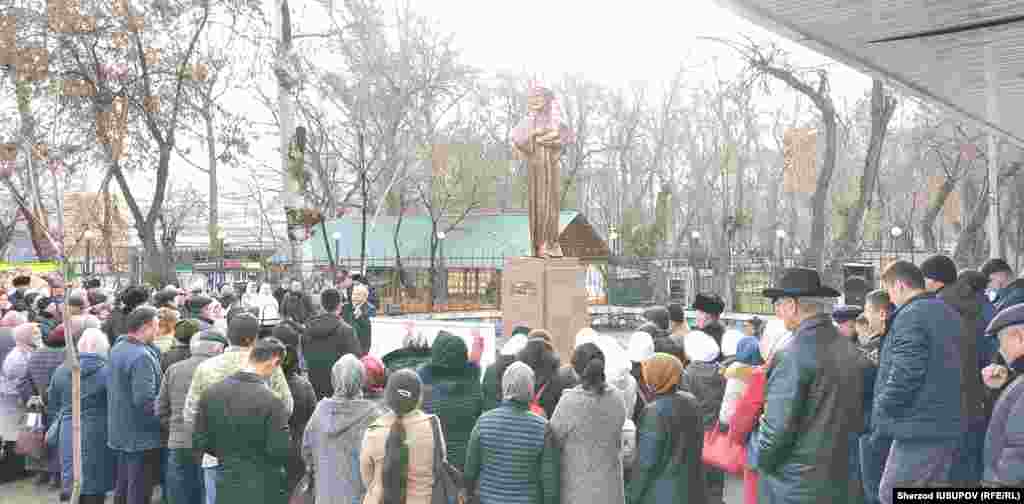 9 февраль куни Ўш шаҳри марказидаги Навоий номидаги истироҳат боғи кираверишида жойлашган Навоий ҳайкали ёнида адабиёт муҳлислари, расмийлар ҳамда мактаб ўқувчиларидан иборат юзга яқин одам йиғилди.
