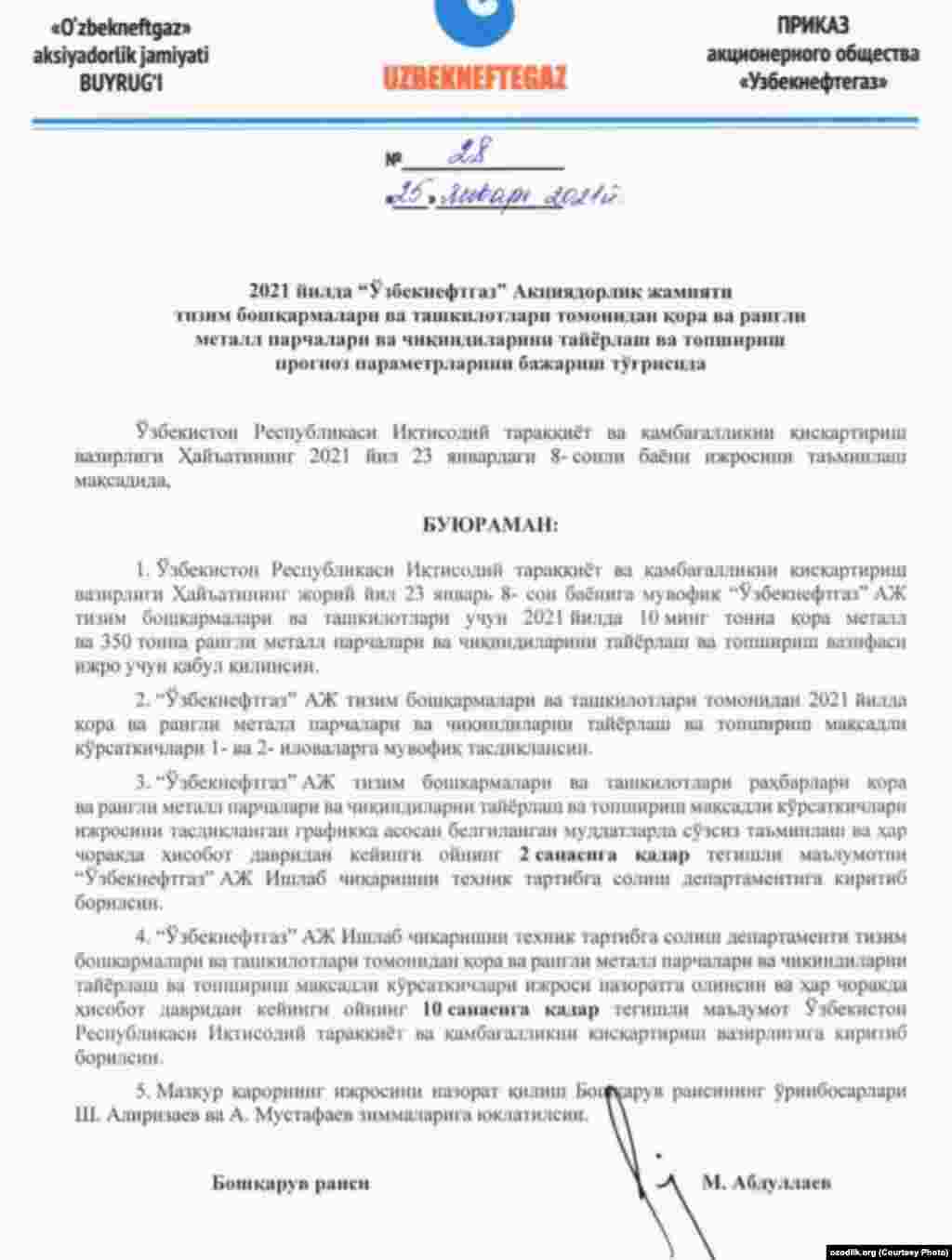 “Ўзбекнефтгаз” АЖ кейинги 1 ой ичида металл йиғишга оид 4 та буйруқ чиқарган бўлиб, Озодлик ушбу ҳужжатлар нусхасини қўлга киритди.