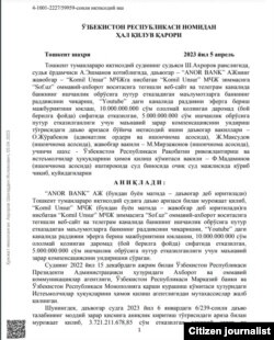 Бу Ўзбекистондаги Интернет нашрининг молия муассасаси обрўcига путур етказишда айбланиб, катта миқдордаги жаримага тортилганига оид Озодликка маълум илк ҳолатдир.