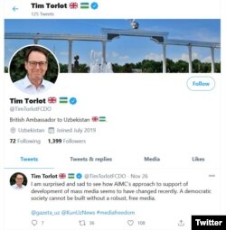 "АОКАнинг оммавий ахборот воситалари ривожланишини қўллаб-қувватлаш ëндашувининг қанчалик ўзгарганини кўришдан ҳам ҳайрат¸ ҳам қайғудаман. Кучли ва эркин ва матбуотсиз демократик жамият қуриб бўлмайди"¸ деб ëзди ўз Twitter каналида Британиянинг Ўзбекистондаги фавқулодда ва мухтор элчиси Tim Torlot 26 ноябрь куни.