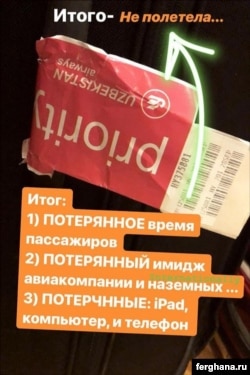 Бобоси номи берилган аэропортда Имон Каримованинг компьютерини синчиклаб текширишган кўринади. Имоннинг сўзларига кўра, шу сабаб рейс бир ярим соатга кечиктирилган. (Flightradar24 портали маълумоти 28 сентябрь куни мазкур рейснинг кечиктирилганини тасдиқлайди).