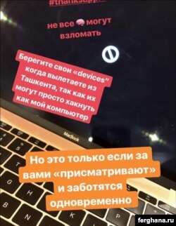 Иккинчи фотосуратда эса рус тилида қуйидаги сўзлар ёзилган :«Ҳар ким ҳам бузиб киролмайди. Тошкентдан учиб кетаётганда ўз «devices» ларингизни эҳтиёт қилинг, чунки компьютеримни текширишгани каби, уларни ҳам бузиб кириб, текширишлари мумкин. Лекин бундай ҳолат агар сизни бир пайтнинг ўзида “кузатиб”, ғамхўрликлик қилаётганларида юз бериши мумкин».