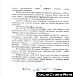 Озодликка нусхаси юборилган ҳужжатлардан бири Ўзбекистон Республикаси Президенти Администрацияси ҳузуридаги Ахборот ва оммавий коммуникациялар агентлиги директори Асаджон Ходжаевнинг 27 октябрь куни имзолаган хатидир.
