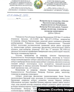 Хатда берилган топшириқларга АОКА директори Вазирлар Маҳкамасида 12 октябрь куни ўтказилган йиғилишнинг 26 октябрь кунги баëнномасини асос қилиб келтирган.