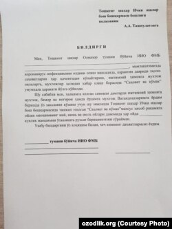 Тошкентнинг Олмазор туманидаги мактаблардан бирининг ўқитувчиси жамғармага пул ўтказиш учун ёзган розилик аризаси нусхасини Озодликка йўллади.
