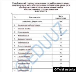 Олий ва ўрта махсус таълим вазирлиги хабарига кўра, хотин-қизлар учун тўрт фоизли қўшимча давлат гранти асосидаги қабул кўрсаткичларининг ҳудудлар кесимидаги тақсимоти тасдиқланган.