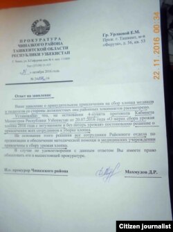 Мазкур қарор асосида Туман услубий ёрдамни ташкил қилиш ва таъминлаш бўлими (собиқ Туман халқ таълими бўлими – Озодлик) ва тиббиёт муассасалари ходимлари пахта теримига жалб этилган”, дейилган Чиноз туман прокурори вазифасини бажарувчи Д. Р. Маҳмудовнинг жавоб хатида.