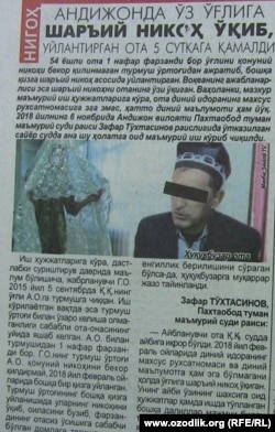 Андижон вилояти Пахтаобод туманида яшовчи 54 ёшли шахс диний маълумоти бўлмай туриб ўғлига шаръий никоҳ ўқигани учун жазоланди. Бу ҳақда Олий суд бир қатор матбуот нашрлари орқали хабар берган. Қайд этилишича, 54 ёшли шахснинг ўғли хотини билан жанжаллашиб қолган. Келин отасиникига кетган пайтда қайнота ҳали қонунан ажрашмаган ўғлини бошқа бир аёлга уйлантирган. Шаръий никоҳни эса ўзи ўқиган. Биринчи келини бундан хабар топиб, яширин равишда никоҳ ўқигани учун қайнотасини жазолашни сўраб ҳуқуқ идораларига арз қилган. Пахтаобод туман маъмурий суди раиси Зафар Тўхтасиновга кўра, расмий диний маълумотсиз никоҳ ўқиган отага 5 сутка қамоқ жазоси тайинланган.