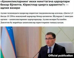 Адлия вазири Русланбек Давлетов фуқаролар билан ўтказилган онлайн мулоқотда кўплаб муҳим масалалар қаторида ноқонуний чиқарилган қарорлар ҳақида гапирди (www.kun.uz, 25 ноябрь).