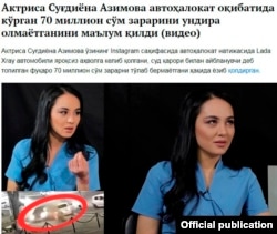 Актриса Суғдиёна Азимова Instagram саҳифасида автоҳалокат натижасида Lada Хray автомобили яроқсиз аҳволга келиб қолгани, суд қарори билан айбланувчи деб топилган фуқаро эса зарарни тўлаб бермаётгани ҳақида ёзди (www.daryo.uz, 25 ноябрь).