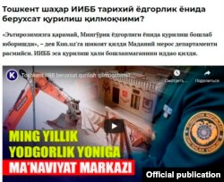 Маданий мерос департаменти бўлим бошлиғи Алишер Ёрқуловга кўра, Тошкент шаҳар ИИББ томонидан комиссиянинг тегишли хулосаси олинмасдан пойтахтнинг Моштабиб кўчаси 31-уй манзилида жойлашган Мингўрик шаҳристони ёдгорлиги ёнида қурилиш бошланган.