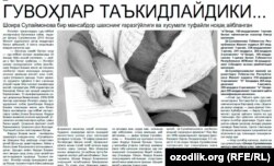Асакада UzAuto Motors ширкати ходимлари акцияси ортидан Меҳнат кодексининг янги лойиҳасидан иш ташлашга доир модда олиб ташланди. Сенат ИИВдан тиланчиларга қарши чора кўришни сўради. Прокурор суд-тиббий экспертиза ходимини қасддан қаматишда айбланмоқда. Жорий ҳафта ўзбек матбуоти шу каби воқеалар ҳақида хабар берди.