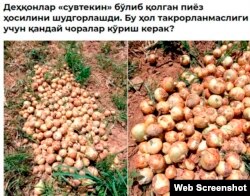 “Қумқўрғон чорбоғи” фермер хўжалиги раҳбари Абдурасул Шароповнинг айтишича, бу йилги пиёз ҳосили яхши бўлса-да, нархлар ачинарли даражада паст – килоси 300 сўм. Шу сабаб ҳосилни йиғиштириб олиш икки карра молиявий зарар келтиради. Ундан кўра, пиёзнинг устидан тракторда ҳайдаб юбориб, ўрнига бошқа экин экилгани яхшироқ.