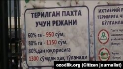 НАРПАЙ. “Самарқанд вилояти Нарпай тумани Мустақиллик маҳалласидан мактуб йўлламоқдамиз. Биз маҳалламиз ҳудудидаги “Худоёр Ҳосилот” фермер хўжалигида пахта теряпмиз. Аммо теримчиларга шароит яратилмаган. Иссиқ овқат ва чойни айтмай қўяқолайлик, ҳатто тоза ичимлик суви ҳам йўқ. Қўшни фермерлар теримчиларга бир кило пахта учун 750 сўм ва ундан кўпроқ тўламоқда. Бизга эса 650 сўмдан беришмоқда. Шунда ҳам ҳар 10 кило пахтадан 1-1,5 кило чегириб ҳисобланмоқда. Шароит яратиб беришини сўраб фермер хўжалиги раҳбарига арз қилайлик десак келмайди. У ишни ишониб топширган бригадир эса ҳеч қандай ёрдам бермаяпти”.