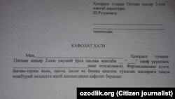 ҲАЗОРАСП. “Хоразм вилоят, Ҳазорасп туман, Питнак шаҳридан ёзмоқдамиз. Бизда янги челленж! Мактаб раҳбарлари ота-оналардан фарзандларини кузги йиғимлар, хусусан, пахта теримига жалб этмаслик ҳақида кафолат хати ёздирмоқда...”