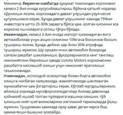 Эслатиб ўтамиз, UzAuto Motors ширкати томонидан автомобиллар нархи 21 фоизга оширилгани жамоатчиликда кучли норозилик уйғотди. Аммо парламентдан президентга қадар – юқори минбарлардан айтилган кескин танқидларга қарамай, автомобиллар нархи қимматлигича қолаверди.